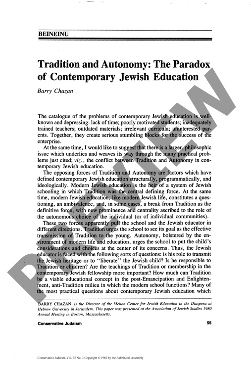 Tradition and Autonomy: The Paradox of Contemporary Jewish Education: Beineinu