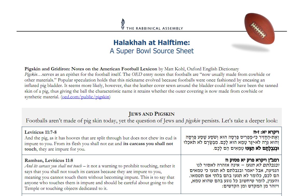 "אם תקישו בגוגל את המילים 'עור חזיר' ויהדות תמצאו אלפי מאמרים הסוקרים את התייחסות היהדות למשחק הפוטבול בעקבות העניין שהכדור אתו משחקים מיוצר מבהמה טמאה, החזיר" מסבירה עשירה קוניגסברג ל'מקור ראשון' מביתה בארה"ב. "אנחנו תמיד מנסים ליצור דפי מקורות לרבנים שלנו בכדי לסייע להם בעבודה היום-יומית מול חברי הקהילה. שיערנו שחלקם ישמחו לדבר עם חברי קהילתם בשבת או בבית הכנסת ביום ראשון בבוקר עם אנשי הקהילה על הסוגייה ההלכתית המעניינת." קוניגסברג מספרת כי רבנים קונסרבטיביים רבים השתמשו בדפי המקורות במהלך השבת האחרונה וכי חלקם אף ישבו עם חברי קיהלתם על הנושא במהלך השיעור שהתקיים בבית הכנסת לאחר התפילה, ממש לפני ההתארגנות למשחק.