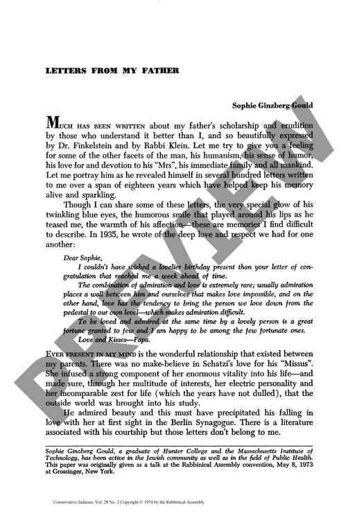By Sophie Ginzberg Gould for CJ vol. 28 no. 2, Winter 1974