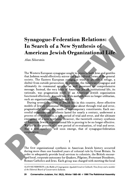 Synagogue-Federation Relations: In Search of a New Synthesis of American Jewish Organizational Life