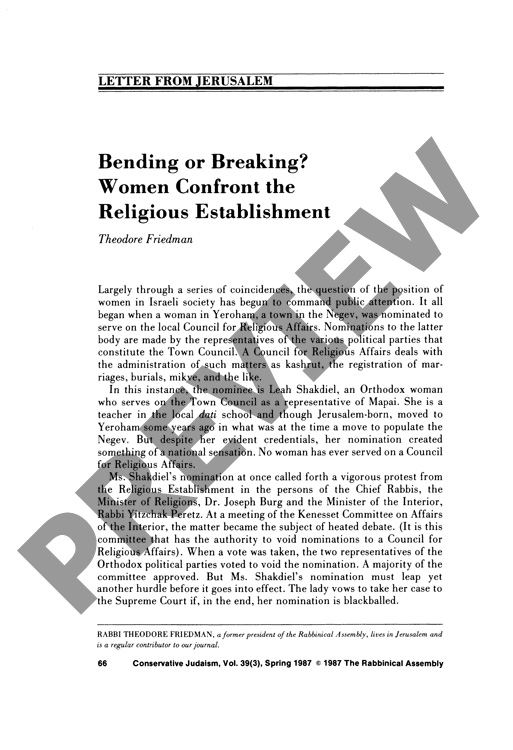 Bending or Breaking: Women Confront the Religious Establishment: Letter form Jerusalem