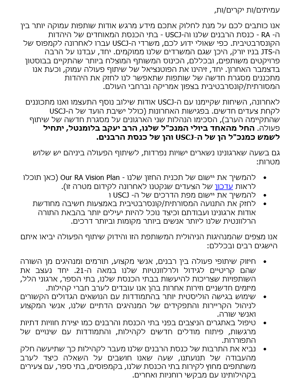 RA-USCJ Partnership Announcement (Hebrew)