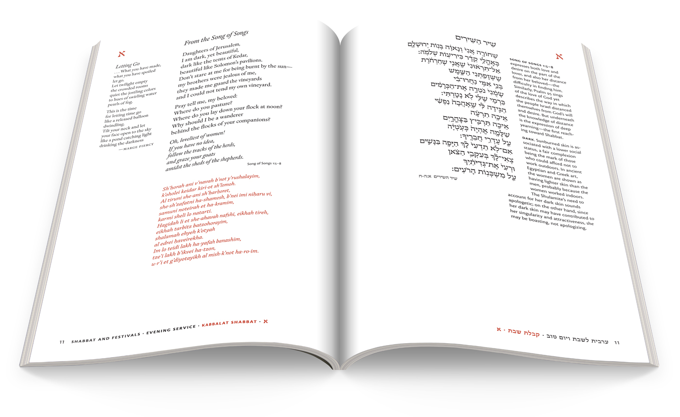 It’s a beautiful book. Martin Buber once remarked that Jewish book publishing began with beautiful Renaissance editions and then deteriorated, aesthetics no longer a consideration. Our designer Scott-Martin Kosofsky has tweaked the digital Hebrew font and made it into a compelling design element. Each line of Hebrew text and English translation is thought through – how long should it be? Where are the proper line breaks? How does each page convey meaning? This is a book which turns to the Renaissance for inspiration as it fosters a new Jewish renaissance.